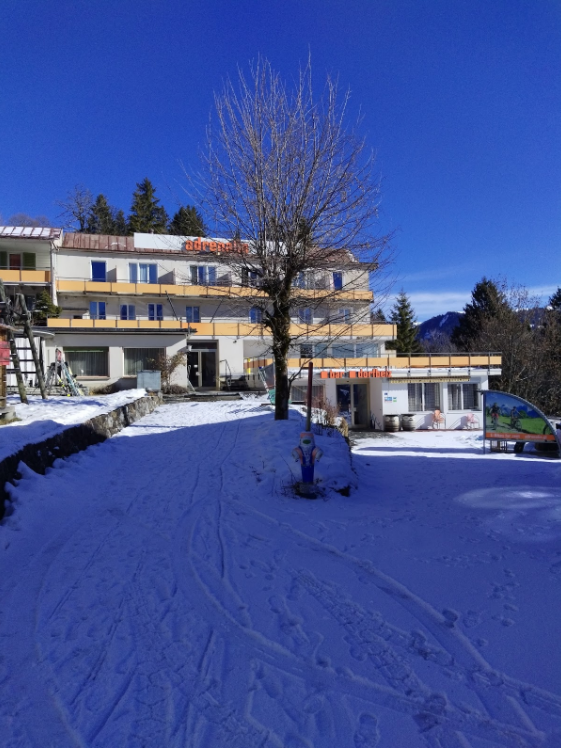 據說每到冬季,Adrenalin的人員組成便會聚集許許多多的,以西班牙文為母語的老師與志工。而在一月中來到這裡的我,恰好碰上了這個特殊的時期,因此,每當到了吃飯的時間,飯廳裡總是充斥著此起彼落的嬉鬧聲,以及震耳欲聾的西文流行曲。起初,我有點擔心性格沒有那麼外放的自己沒辦法融入這群熱情洋溢的人群之中,然而,族群和語言的差異從未在這裡區隔彼此。每個早晨,當我頂著亂髮推開飯廳的門準備吃早餐,總會有好幾張燦爛的笑臉對著我說:「Goodmornig Jessica!」;或是有時我坐在吧台偷看今天吃什麼時,會突然有通心粉從廚房伴隨爽朗的大笑聲朝我臉上飛射而來。我不像大家一樣酷愛滑雪,大部分的時間,我都坐在飯廳的一角,一邊沈醉於窗外的風景,一邊在信紙上寫下當下的感覺,或是攤開馬克筆在畫紙上笨拙的塗鴉。當人們手上的事情告一個段落,他們會坐到我身旁陪伴我,而我也會放下手邊的事,詢問他們今天做了什麼有趣的事。甚至有一次,廚師和其他老師看見我正在畫畫,便把我包圍起來跳起了舞,讓我害羞得跳到餐桌下躲起來。在Adrenalin的日子,是我自成長以來,心靈最為放鬆的時光。我得以隨時保有自己,可以搬張椅子,靜靜地在有陽光灑落的地方寫信或畫畫;也可以背起書包,跟著朋友們肩並著肩去城裡晃晃,或是沿著Braunwald蜿蜒的小路沒有目的地漫步;可以興致一來就去遊戲室開啟手足球大戰;也可以什麼也不做,僅僅是趴在人們身旁聆聽他們在說些什麼。Brauwnald的高山總是披著白雪,而它擁有讓我的心保持平靜的魔力,光是看著金黃色的山頭,就足以讓人安心。我想,這就是我在這裡每天都過的很舒服的原因吧!