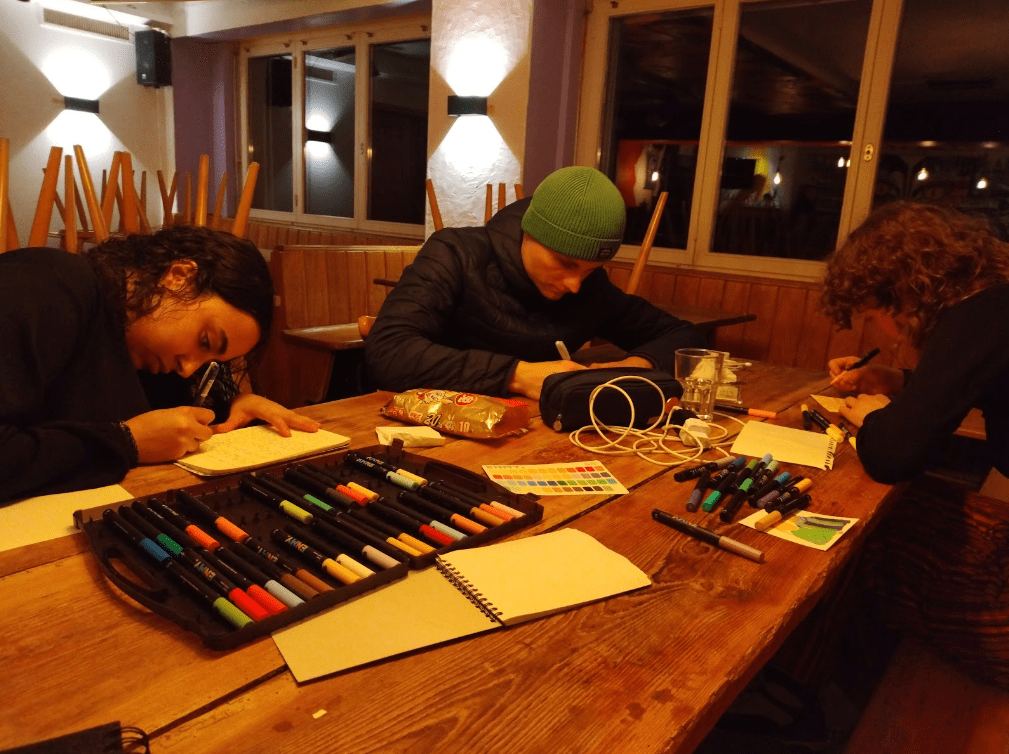 拿著紙筆寫信與畫畫的日子,構築了我在Adrenalin的日常。我常常在獨處的時候想著,該如何把我所有在瑞士度過的時光,化為圖像與文字留存下來呢?然而每當我越執著於這麼做,就越是深刻地明白,完美的保存與轉譯一段時光的方法並不存在。這層體悟,讓我對這趟旅程的每一段相遇,都愈發的珍惜。我還記得剛抵達Braunwald的第一個傍晚,我就和Bruno, Isaac和Liberto在酒吧前打起了雪仗;還記得Marlene牽著我的手,溫柔地帶著我從Baby Slope沿著小徑一路滑雪回到旅店;也記得Karina在腳受傷後,每當我幫她推開客廳的門,她都會哽咽著向我表達感激。我喜歡早晨Sofia見到我的時候,捧著我的臉和我說早安的時刻,也喜歡Roaa和Nardeen看見我在畫畫時,總會不厭其煩地坐在我的身旁陪伴我;也喜歡在半夜時分趴在friLingue room的沙發上,和Andrea分享彼此的故事。那些去蘇黎世逛遍的商店,那些坐在chairlift上拍下的美景,那些玩「Asshole」時爆出的笑聲,那些不願分離而流下的淚水。如果所有的片刻,都將被時間的血盆大口所吞噬殆盡,那麼保存這些回憶的辦法,就只剩牢牢的記住它們。